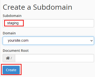 Set up staging site Create Subdomain.Under cPanel > Domains, click Subdomains.Add subdomain name: staging, then click Create.To return to cPanel dashboard, click the waffle menu.Setup copy of site in staging.In cPanel, select Softaculous Apps Installer. Select Installations.Select Create Staging.Under Choose Installation URL, select your staging subdomain.Under Site Settings, select Disable Search Engine Visibility, then click Create Staging.